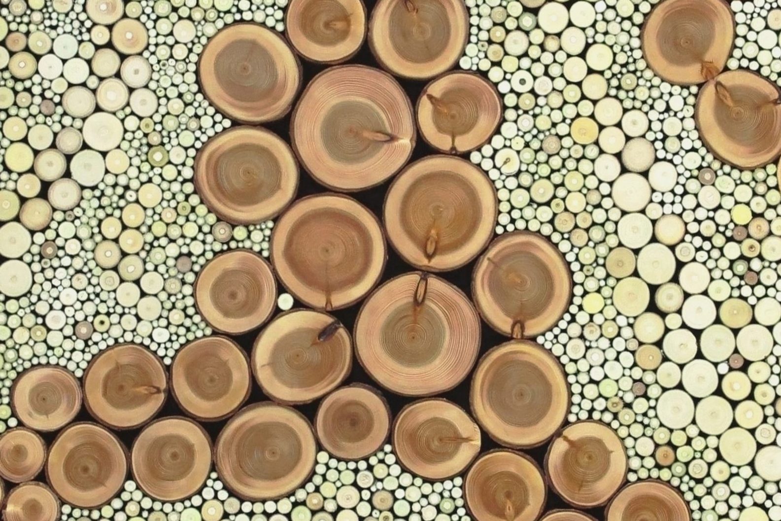 Jedes Holz hat seinen eigenen Geruch, Textur und Farbe. Dies stellt die Dynamik der lebendigen Umwelt dar, die nicht starr in sich verharrt, sondern sich immer wieder wandelt.